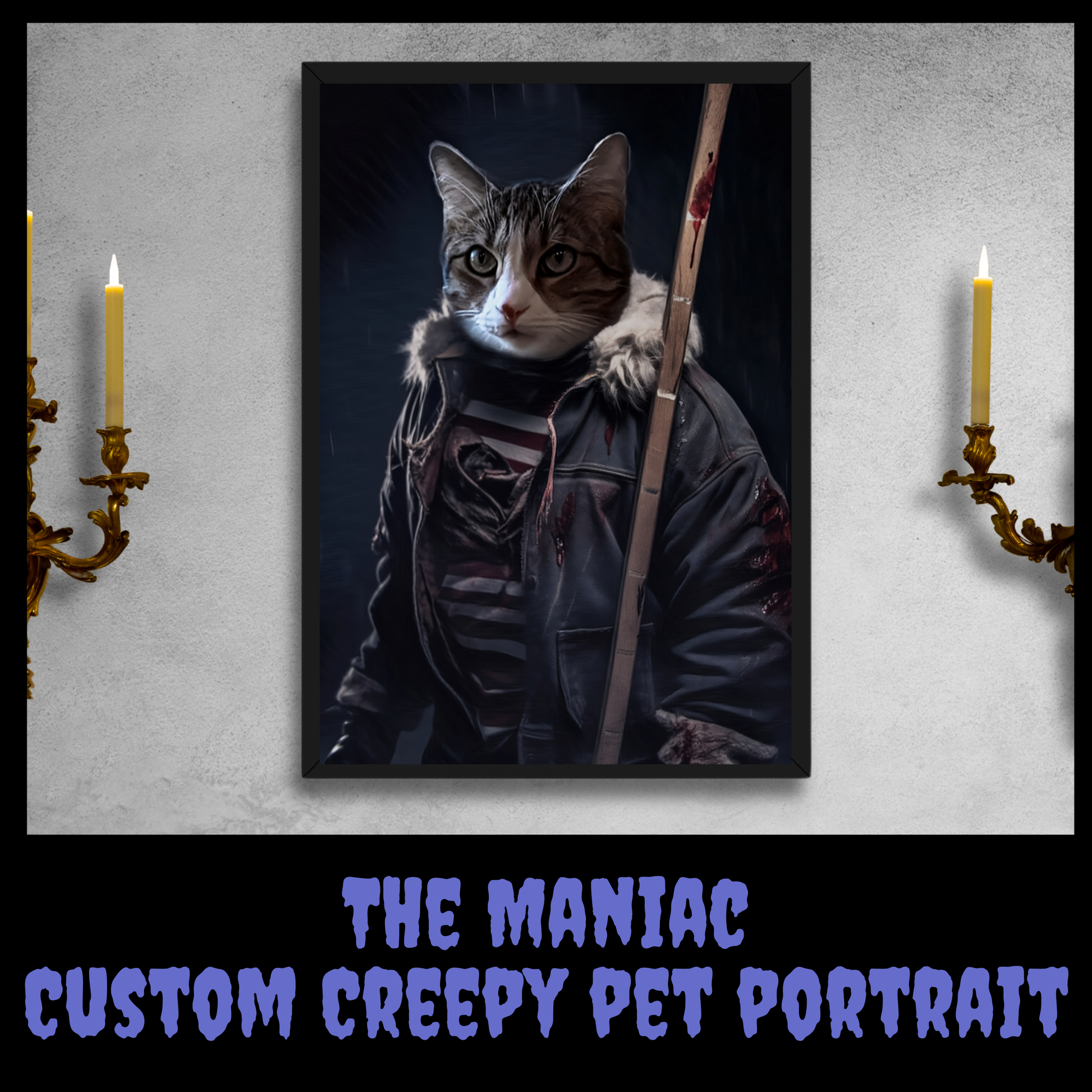 Elevate the eerie ambiance of your living space with a customized portrait featuring your pet transformed into "The Maniac"