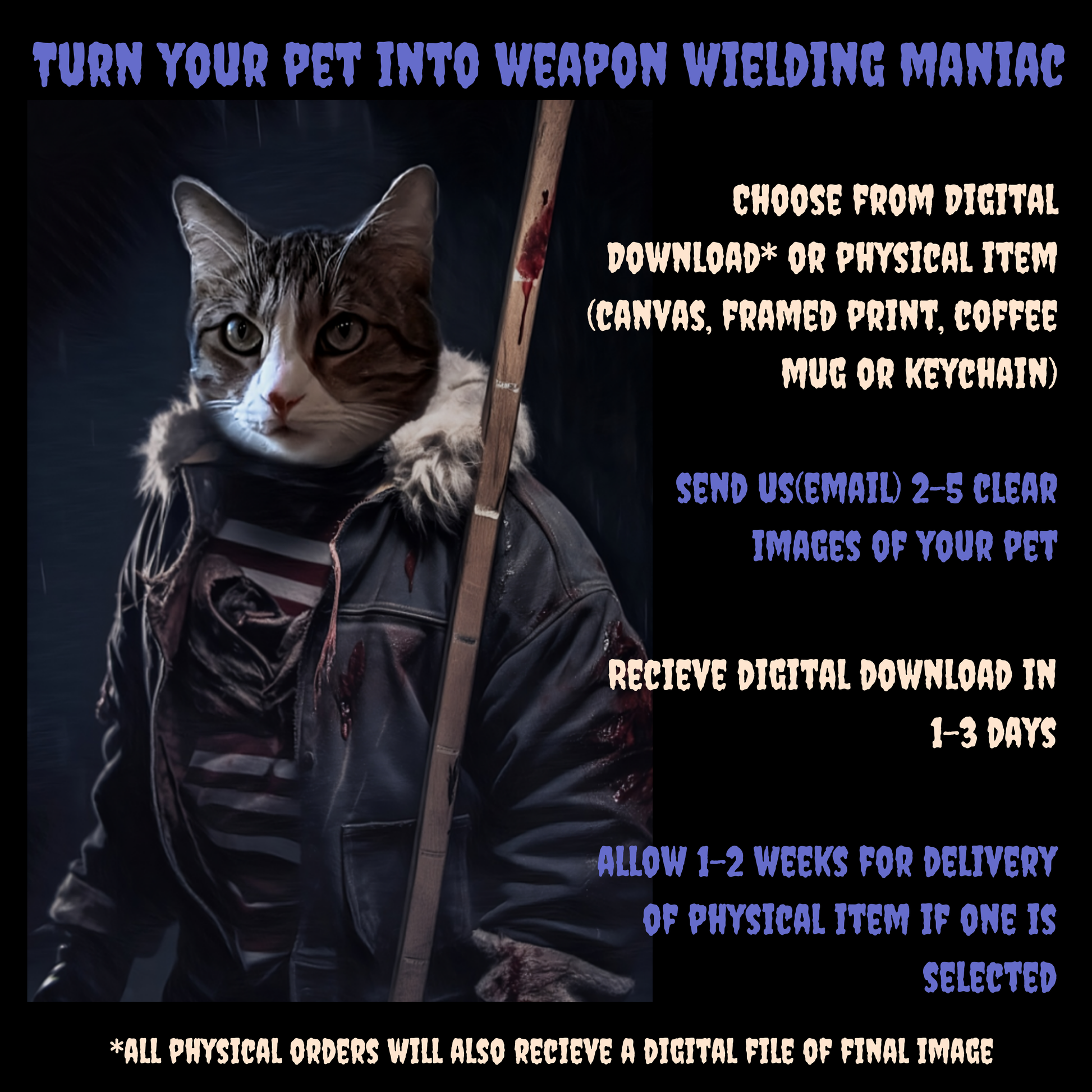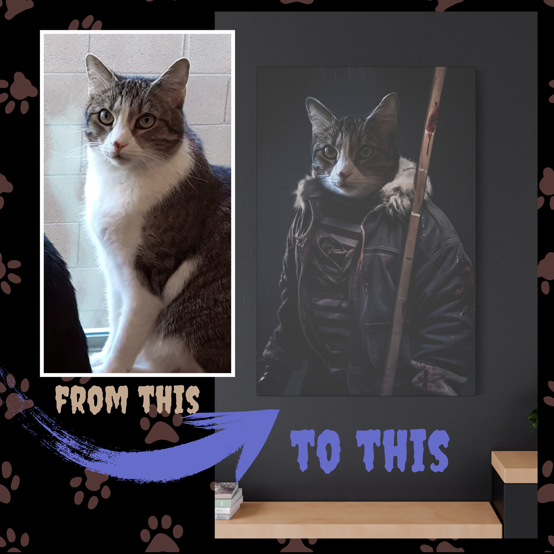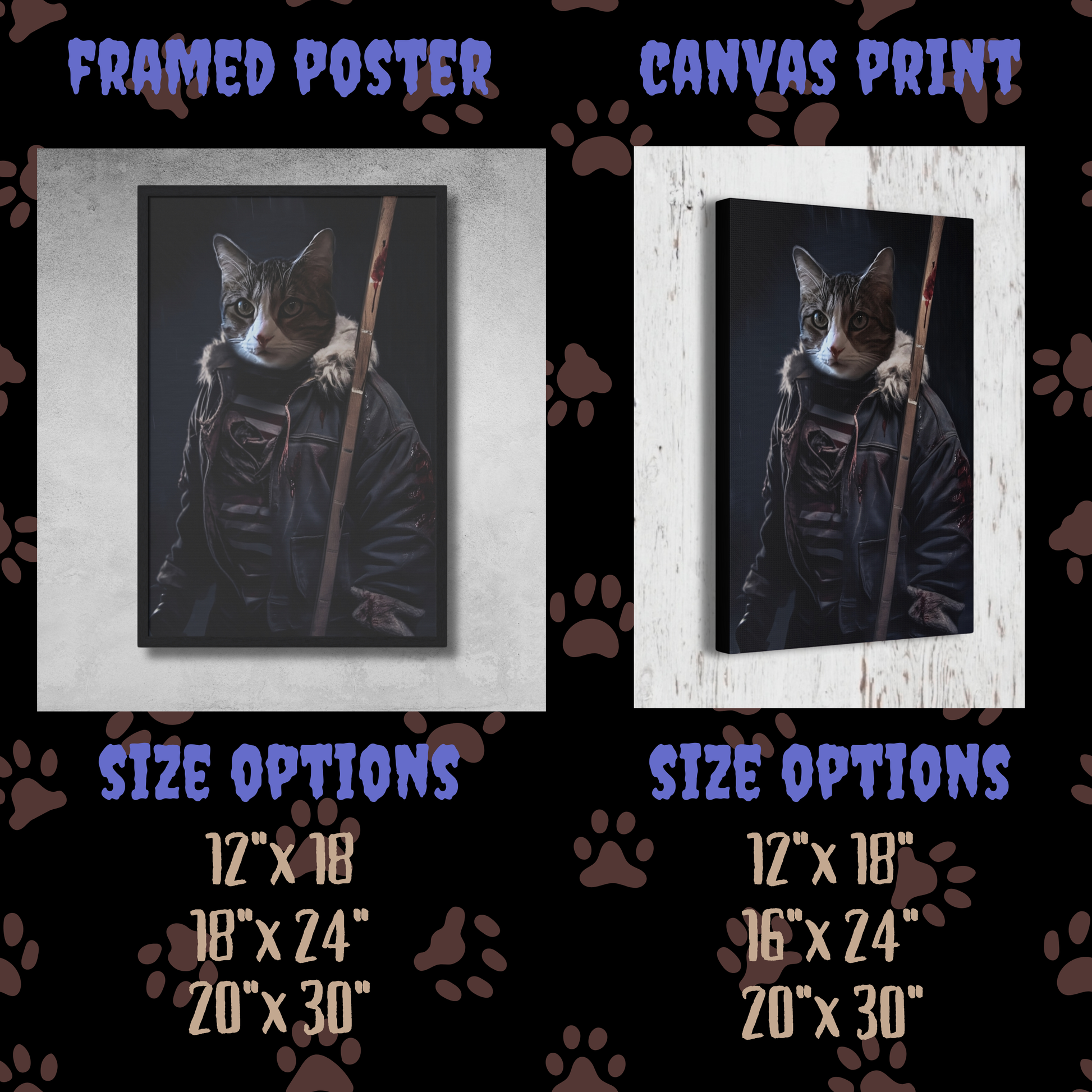 Perfect for horror buffs, slasher film lovers, and pet owners who know their furball secretly runs the show, The Maniac is a must-have for anyone who enjoys a little fear factor in their decor. Whether your pet is a true menace or just has that "you’re next" expression, this custom artwork is guaranteed to make a chilling statement.