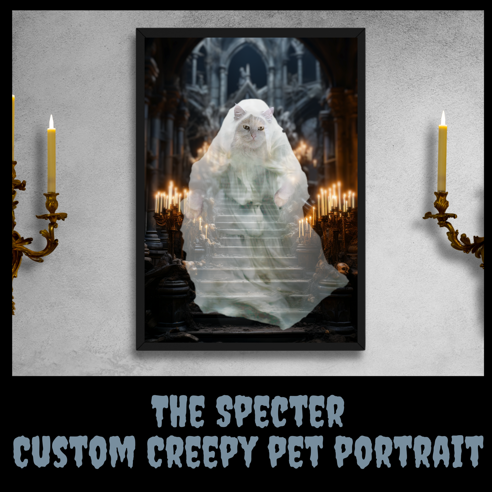 Elevate the eerie ambiance of your living space with a customized portrait featuring your pet transformed into "The Specter"