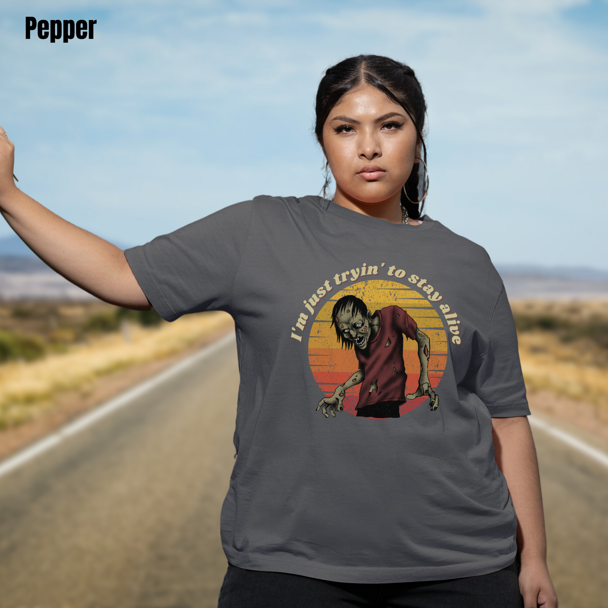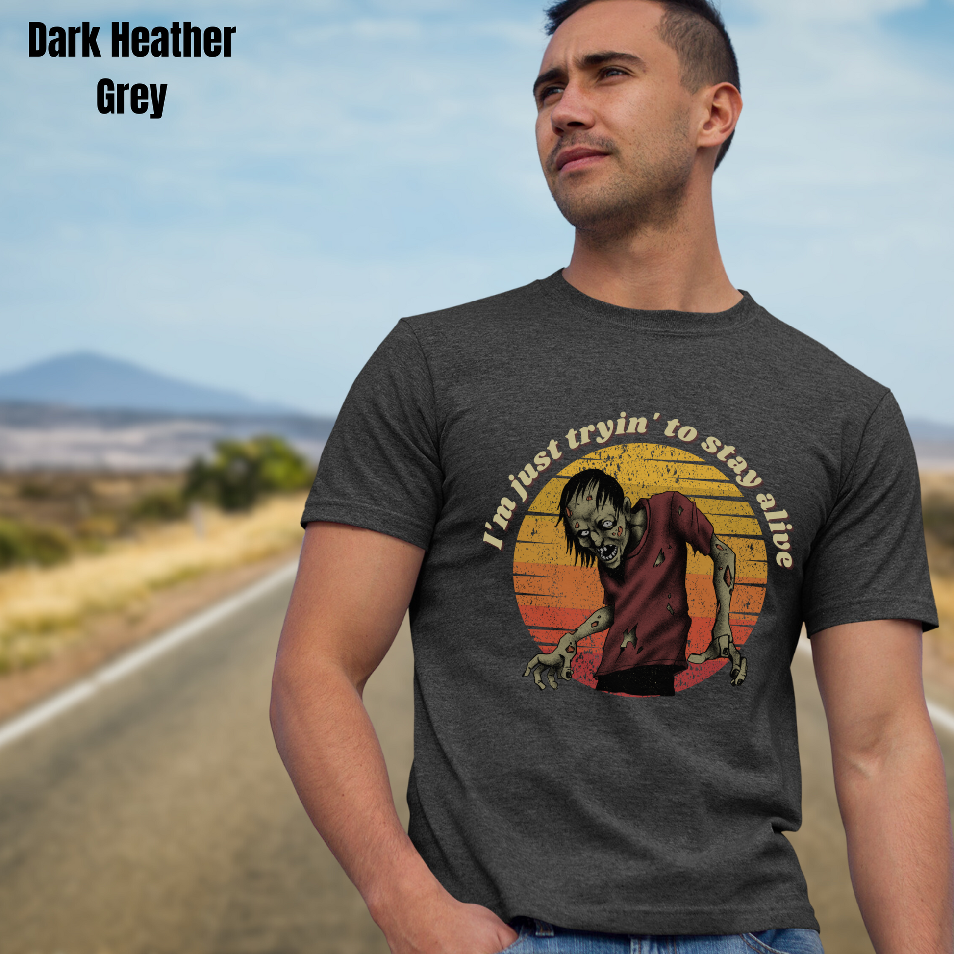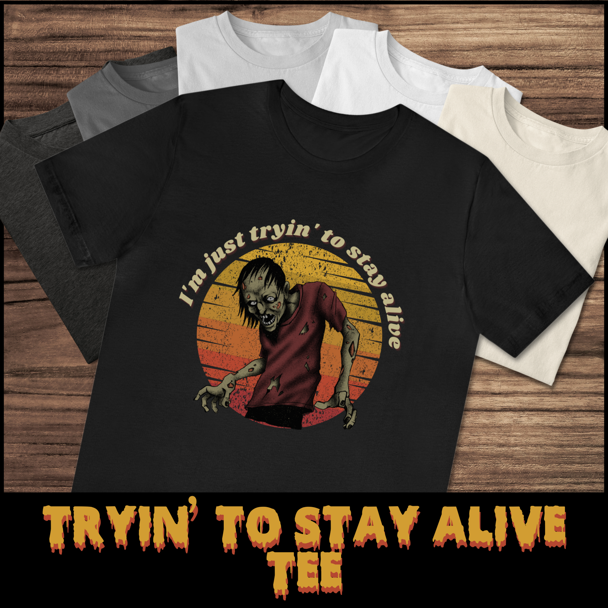 Well, we've got the perfect tee for you. Introducing our "Tryin' to Stay Alive" t-shirt, featuring a moody zombie set against a colorful backdrop of red, orange, and yellow.