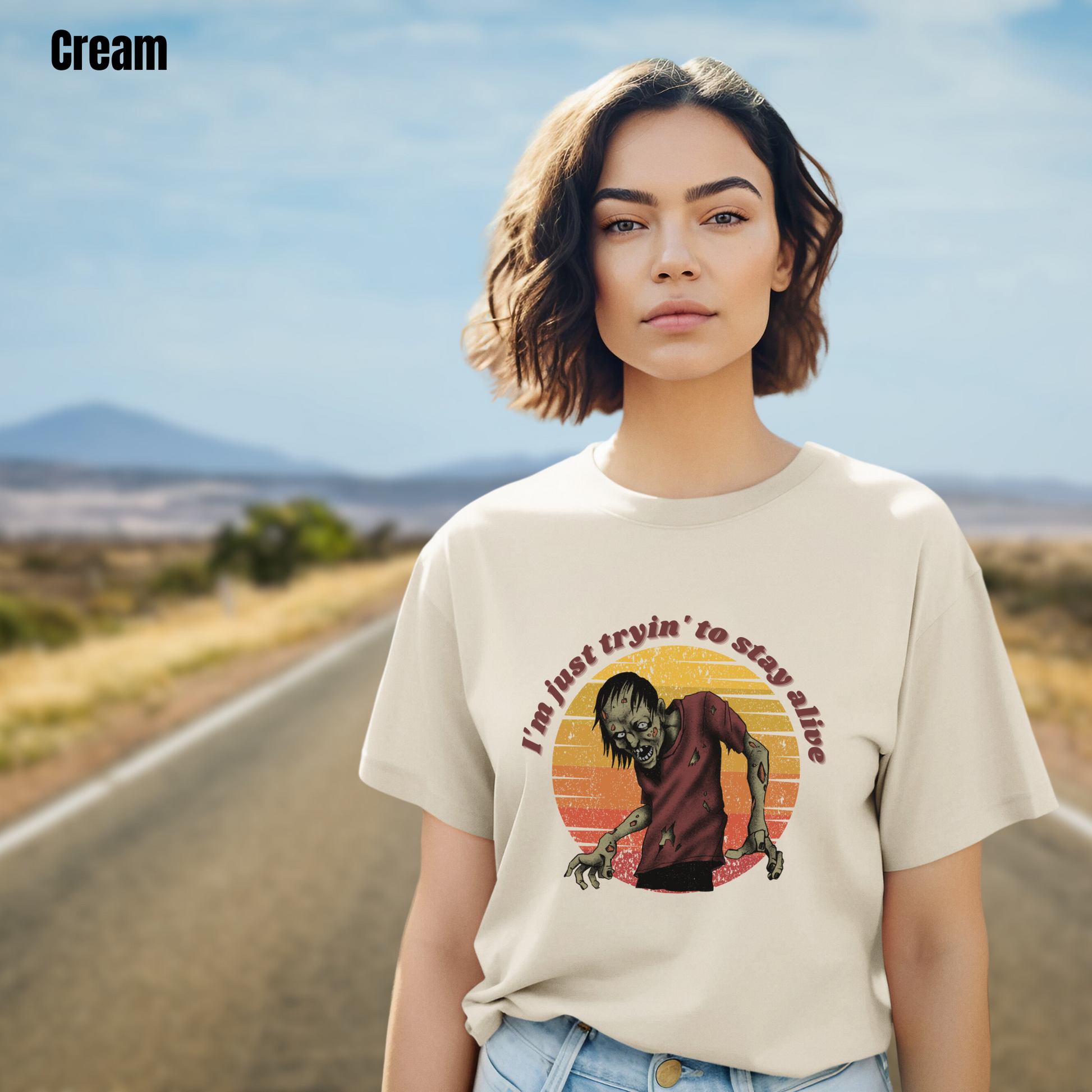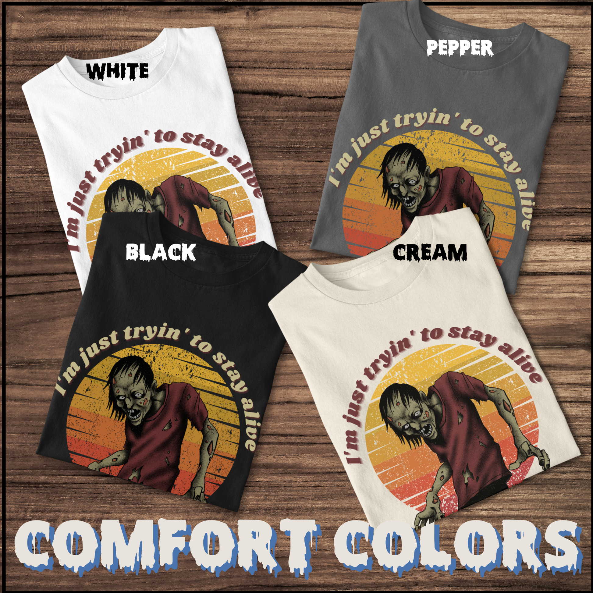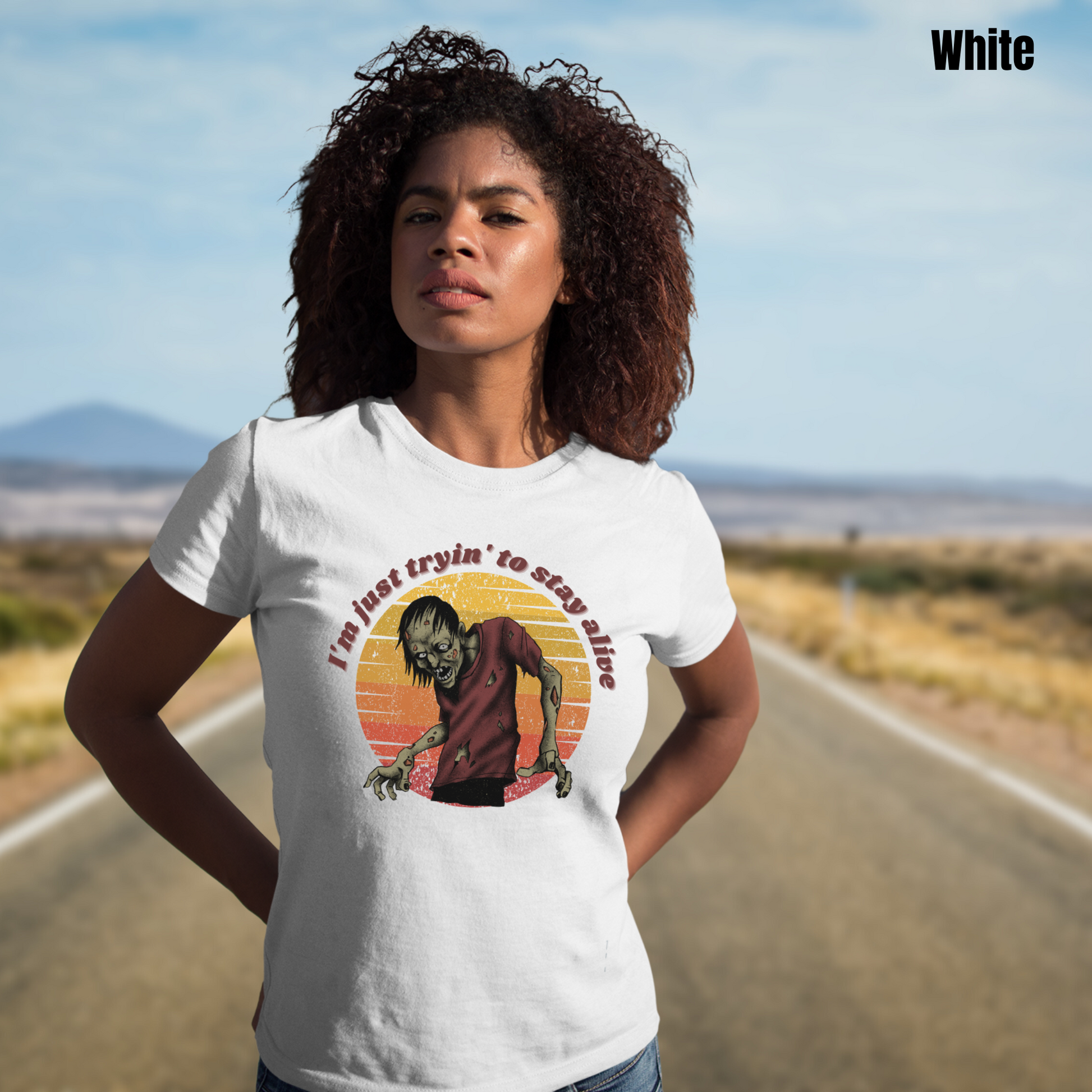 Well, we've got the perfect tee for you. Introducing our "Tryin' to Stay Alive" t-shirt, featuring a moody zombie set against a colorful backdrop of red, orange, and yellow.