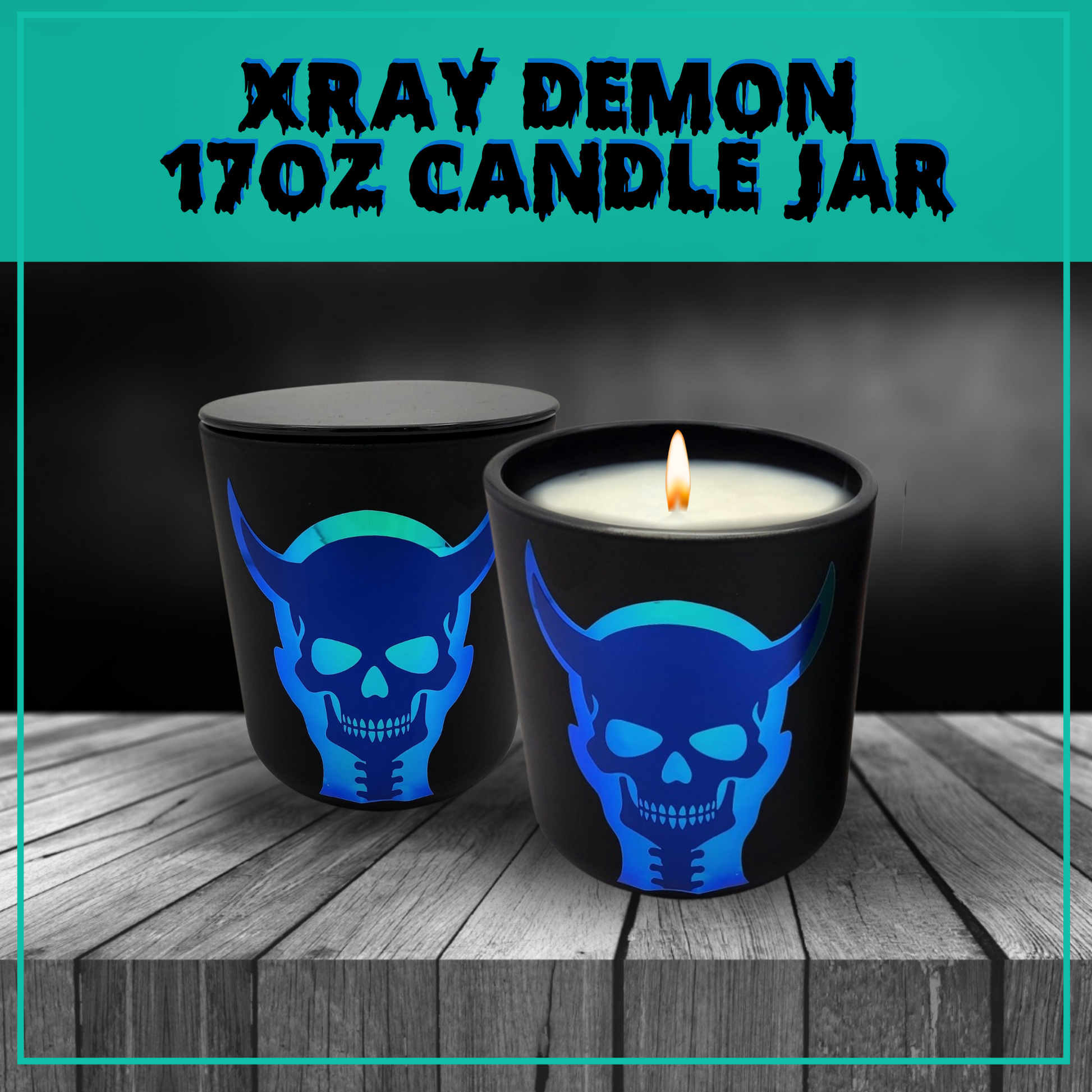 Immerse yourself in the beautifully dark allure of this 17oz reusable jar candle, thoughtfully crafted for a unique and ethereal experience. Featuring an X-ray image of a horned demon in a blue and teal metallic. Our commitment to sustainability shines through with ethically sourced soy wax, free of any dyes, and a touch of natural fragrance oil that elevates your space without compromise.